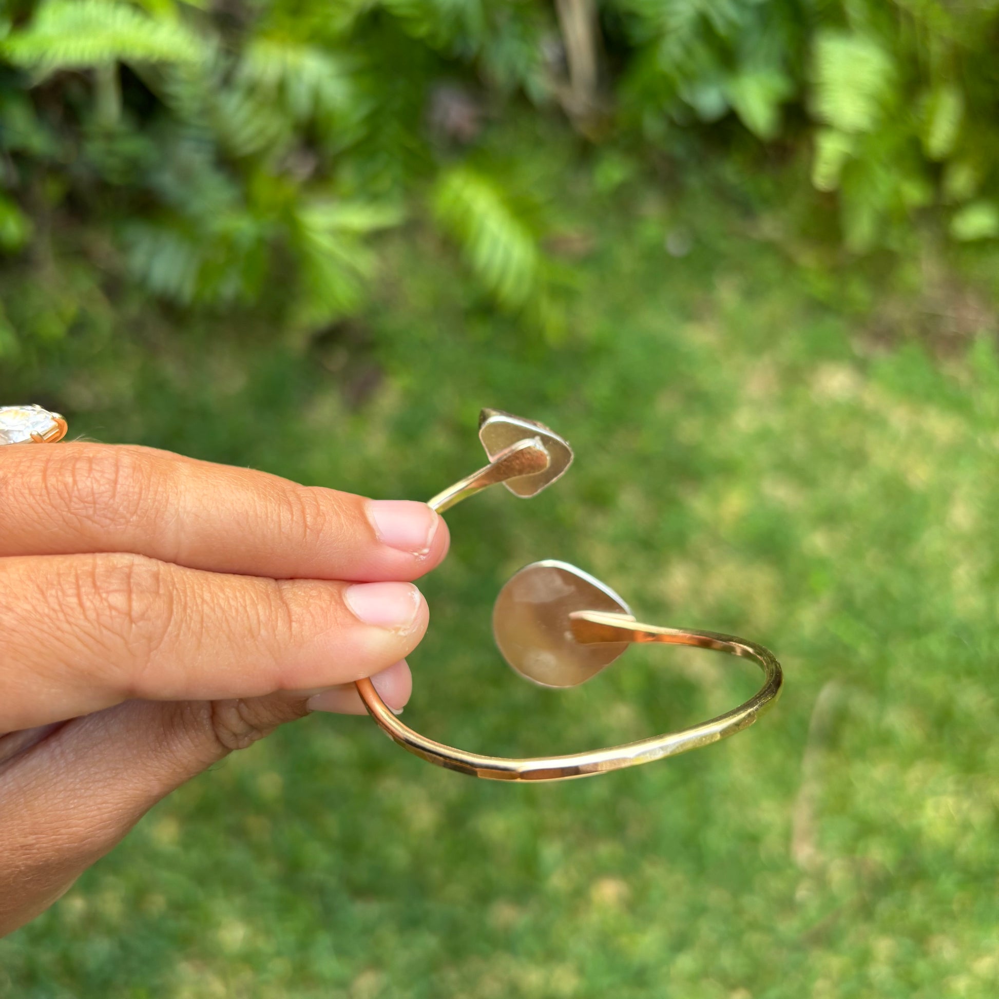 The Sunrise Shell Cuff is an eye-catching piece that adds a unique touch to any look. Made of high-quality 14k gold fill and argentium silver. It features a genuine sunrise shell paired with a handpicked piece of Kauai seaglass. This classic design will never go out of style. This cuff is slightly adjustable and made for wrist sizes up to 7.5". Send me an email for more sizing questions (: